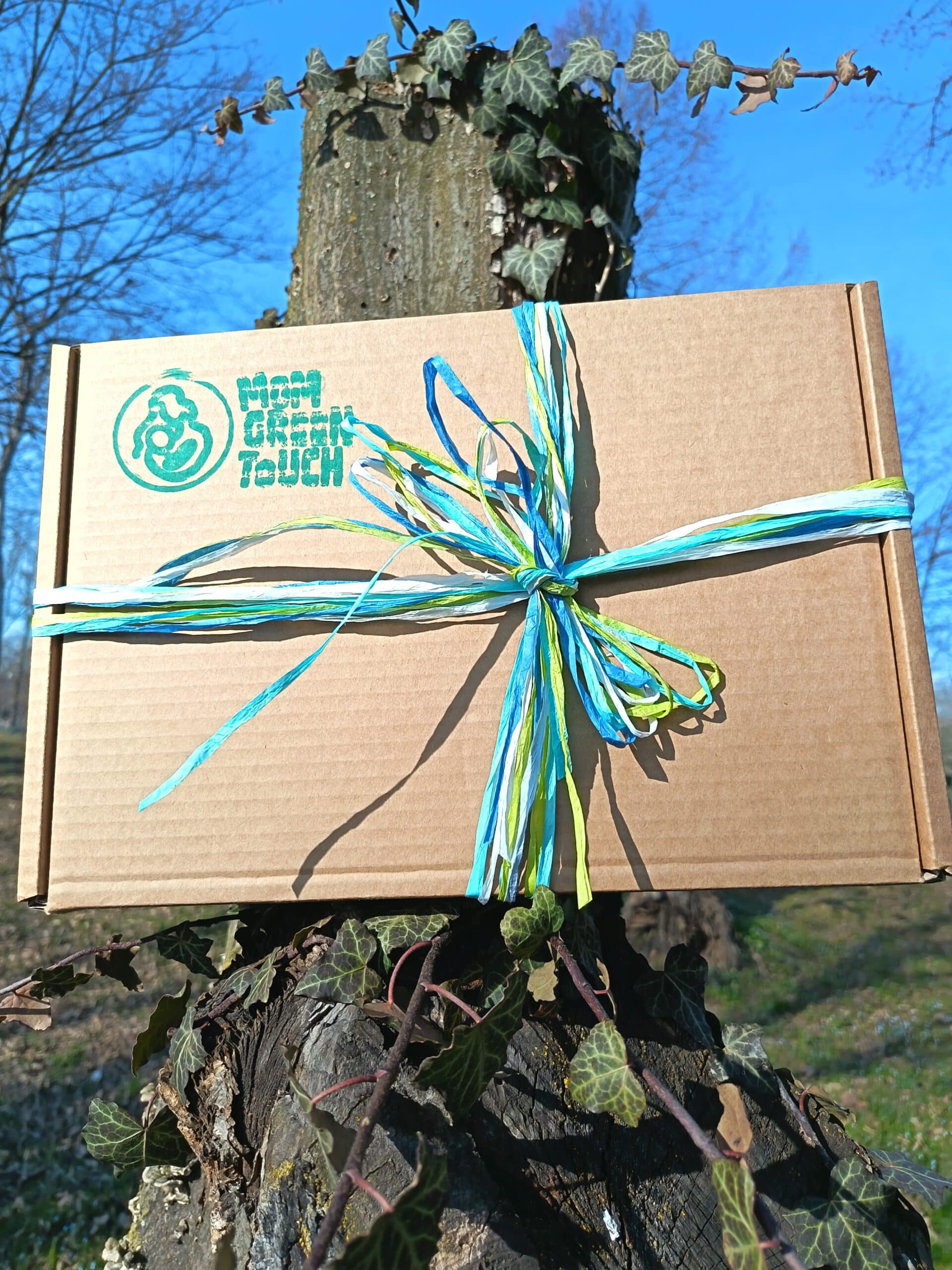 Ogni confezione è un pezzo unico: la prepariamo noi, a mano, utilizzando solo materiali gentili con il pianeta, come la rafia naturale e il mais biodegradabile.